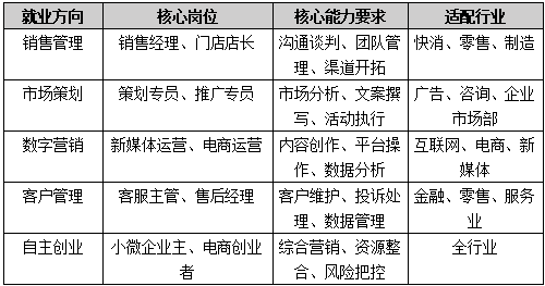 培养面向批发业、零售业、商务服务业、制造业等行业的市场营销专业人员、客户服务管理员、互联网营销师、品牌专业人员等职业,能够从事市场调研、项目销售、数字营销、品牌策划与推广、智能客户服务等工作的高技能人才。