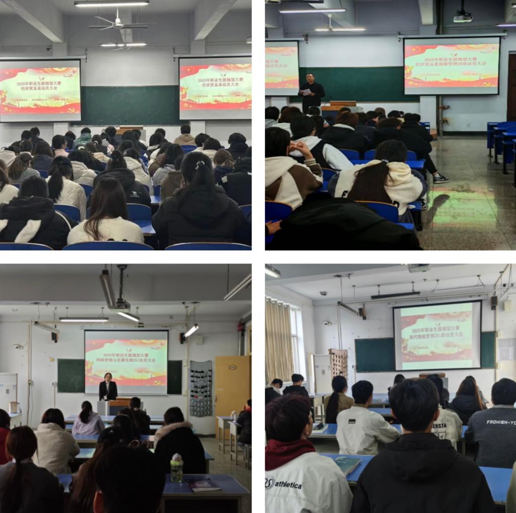 当日晚间,物流管理251班等班级迅速响应,在E305等教室召开动员班会。班主任通过拆解大赛主题“筑梦青春志在四方,规划启航职引未来”,详解成长、就业赛道差异及报名平台(zgs.chsi.com.cn)操作要点,并针对生涯报告撰写、PPT展示等备赛内容答疑。