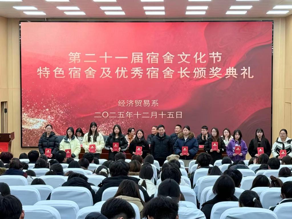 李汶倩老师赞扬经贸学子在第二十一届宿舍文化节活动中做出的贡献并宣布了获奖名单,最终评选出了30个特色宿舍,其中10个被推至校级。会议同时指出校园安全隐患,呼吁师生及系部联动共筑防线。