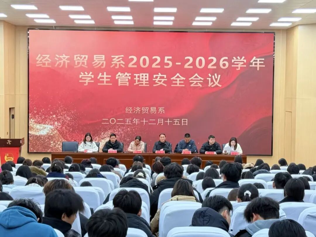 为强化学生安全意识,规范日常管理,表彰宿舍文化建设先进典型,12月15日晚,经济贸易系在K205教室举行2025-2026学年学生安全管理会议。经济贸易系党支部负责人冯正全书记、宣传统战部部长秦立红、学生处马晓川副处长及系部专职辅导员练钊、国歌、李汶倩出席会议,全体学生齐聚一堂,共话安全与成长。会议由经济贸易系学生管理科长吴昊主持。